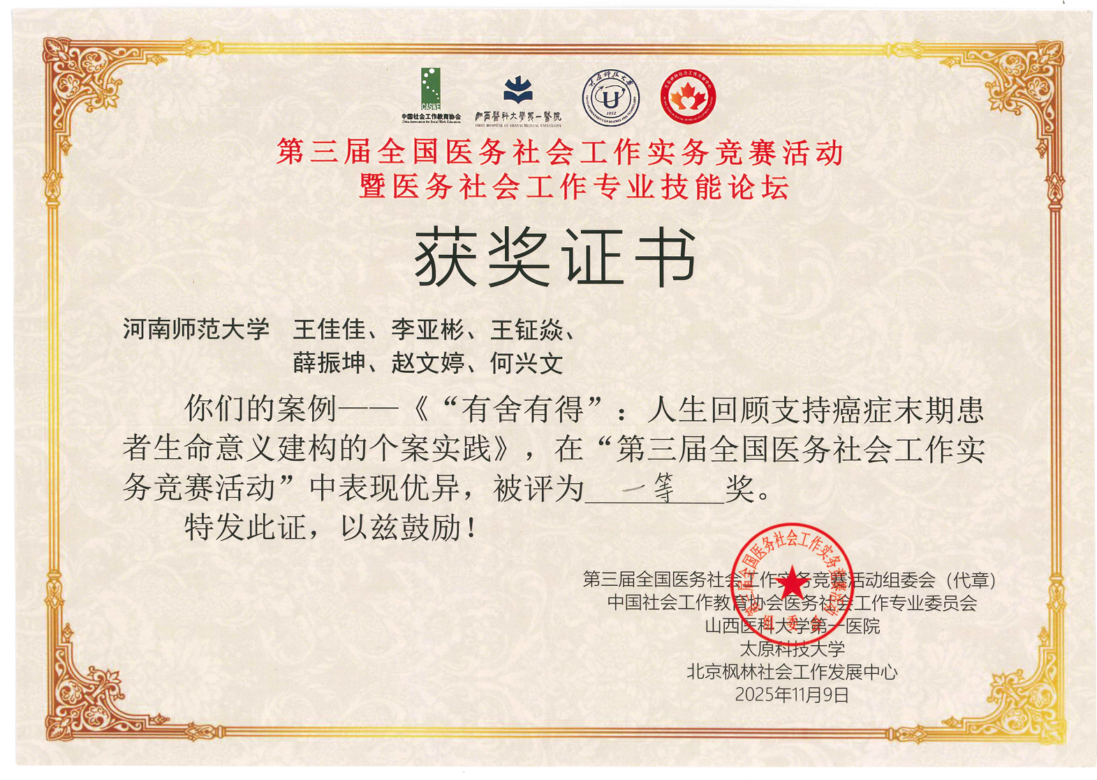 我院提交的参赛案例《“有舍有得”:人生回顾支持癌症末期患者生命意义建构的个案实践》由宋长慧老师指导,王佳佳、李亚彬、王钲焱、薛振坤、赵文婷、何兴文等同学共同完成。该案例以叙事治疗为理论支撑,以人生回顾为核心方法,系统呈现了医务社会工作者运用专业技巧,协助癌症终末期患者建构生命意义的完整过程。项目团队通过晚期癌症患者生命意义量表、简明疼痛评估量表(BPI)、心理痛苦温度计(DT)、社会支持评定量表(SSRS)及灵性量表等工具,对服务对象开展生理、心理、社会、灵性及生命意义的多维度综合评估,不仅有效缓解了患者的情绪压力与身心痛苦,更通过“人生回顾”系列服务,帮助患者重拾生命价值,实现生命晚期的安宁与尊严。