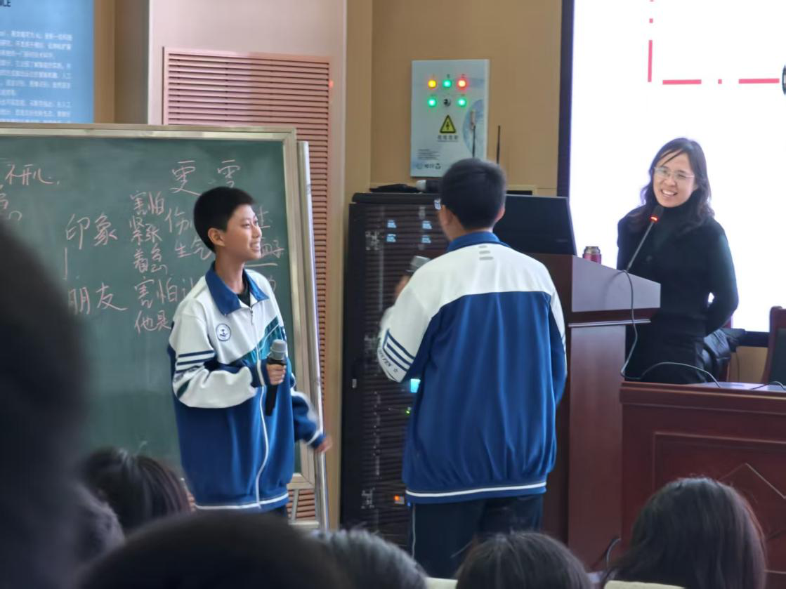 示范课以“情绪有时藏,表达需得当”为主题,分三环节推进:老师通过“小薇未表达感激”“小强输球砸柜门”两个场景引入,引发学生反思情绪隐藏与表达不当问题;随后活动按六人一组精准划分,每组由2名社工专业学生与4名附中初一生组成,大学生带领学生化身“情绪大侦探”,分析志明考试失利沮丧、雯雯争执后生气、炳凡考前紧张的隐藏情绪及成因;角色扮演环节中,学生争相上台,用鲜活场景演绎正确表达:如志明清晰说“考试失利让我沮丧”替代沉默,雯雯主动沟通“争执让我生气,但想好好谈”替代冷战,台下掌声雷动。
