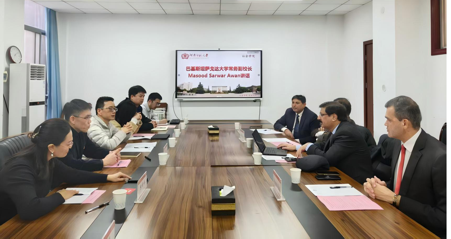 12月5日上午,巴基斯坦萨戈达大学与社会学院交流座谈会在社会学院210会议室隆重举行。巴基斯坦萨戈达大学常务副校长Masood Sarwar Awan、科学学院院长AAmir Ali Chaudhry等代表团成员,社会学院党委书记瞿洪明及相关学科负责人、教师代表出席本次座谈会。本次座谈会由社会学院薛君老师主持。