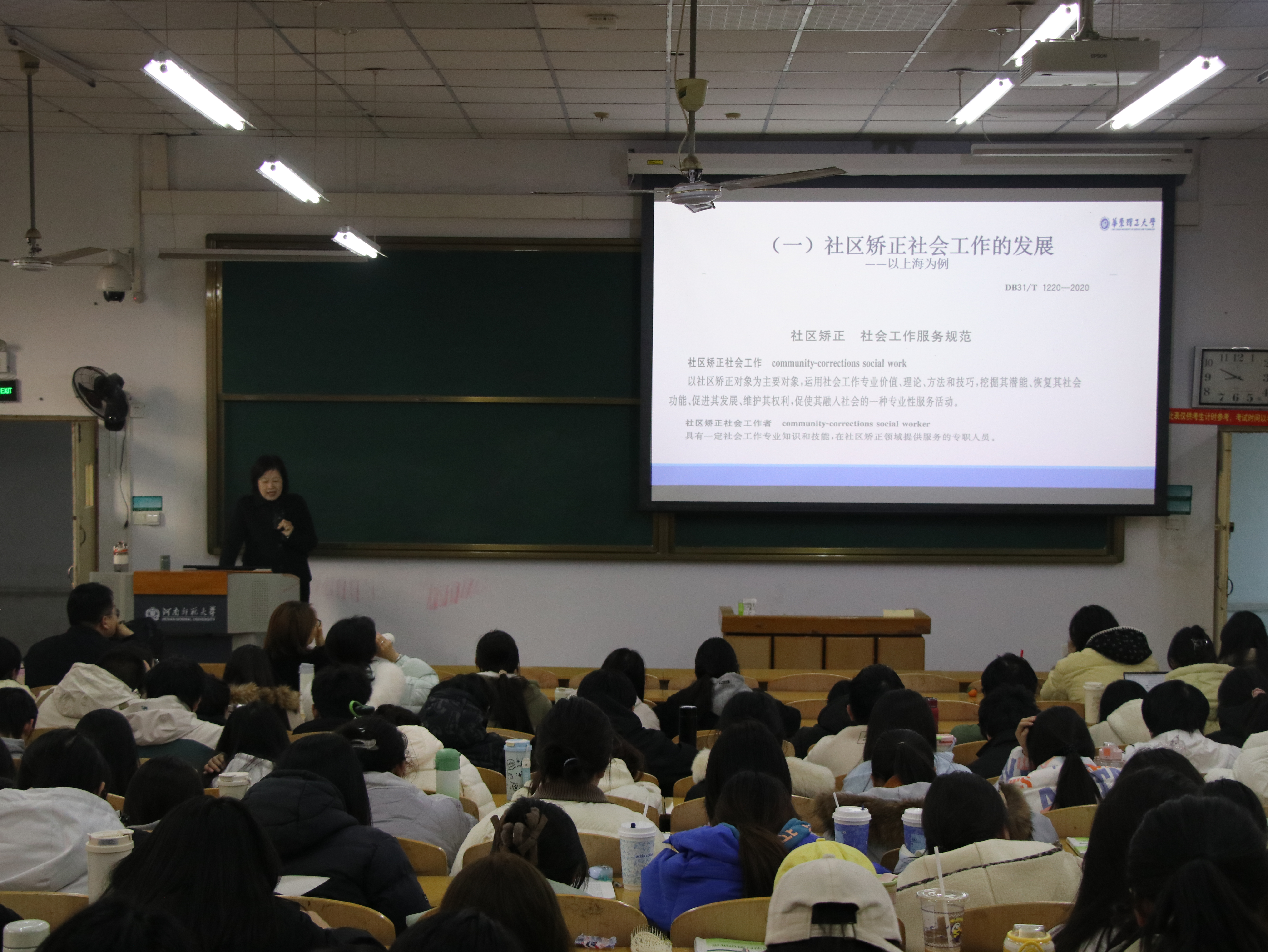 围绕社区矫正、禁毒社会工作、未成年人司法保护三大核心领域,费教授分享了诸多鲜活案例。“一杯水的故事”诠释了对特殊人群的尊重与接纳;禁毒领域的一系列项目,帮助吸毒人员重建社会关系、重启人生;未成年人司法保护中,通过家庭教育指导、社会支持联动等方式,为涉案青少年筑牢成长防护网。她强调,“尊重、平等、助人自助”是司法社工的核心理念,专业服务能让特殊人群重获社会价值。作为参与《未成年人保护法》修订的专家,费教授还解读了司法社会工作在国家治理中的重要作用,鼓励青年学子以专业力量助力社会公正。整场讲座案例鲜活、内涵深刻,让师生对司法社会工作有了全面认知。