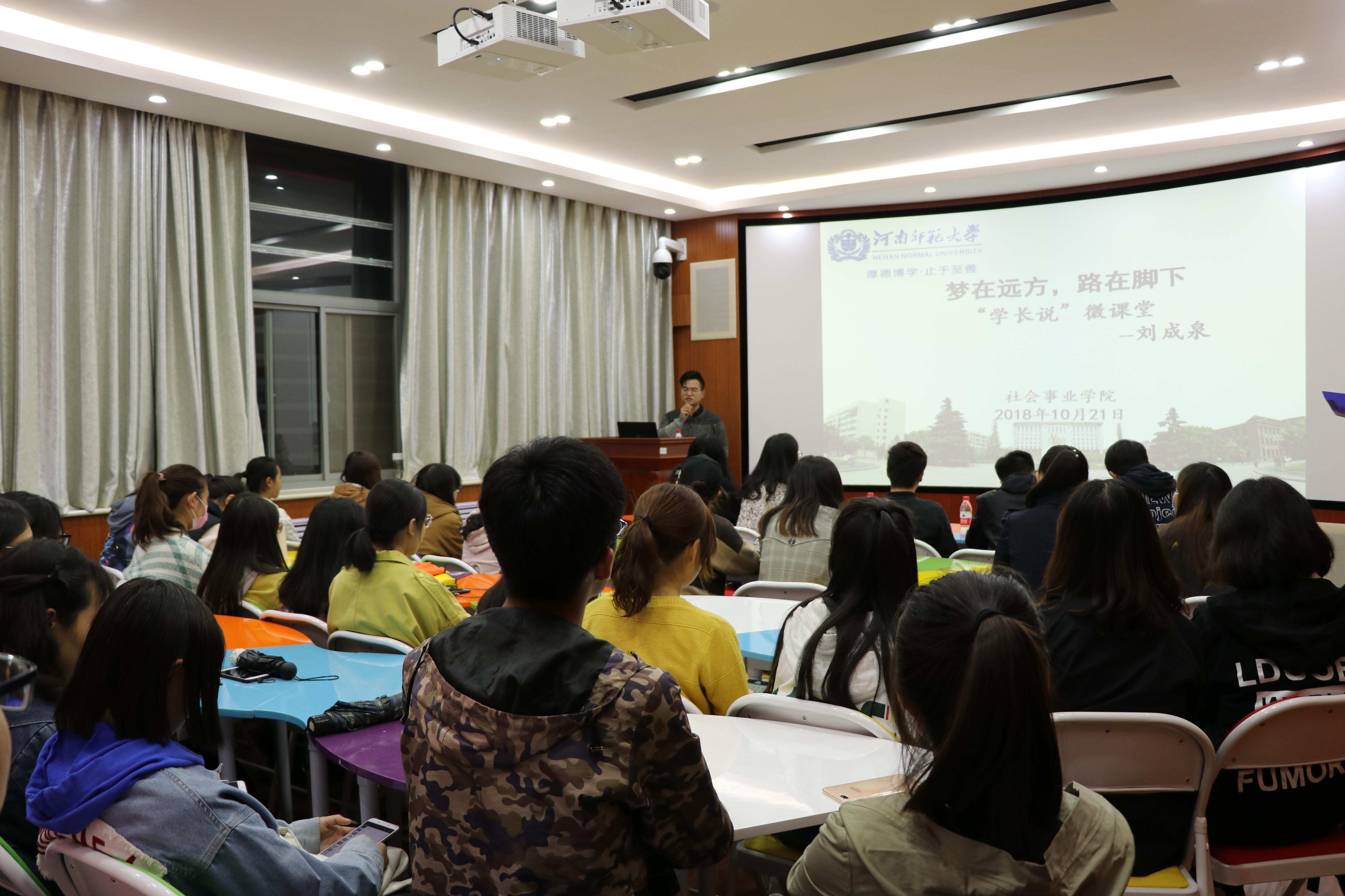 为加大创业就业培训力度,引导学院学生树立正确的创业就业观,10月21日晚,社会事业学院于院办公楼503室举办“学长说”微课堂活动,学院团委负责人田嘉玺携50余名学生共同参加了此次活动。