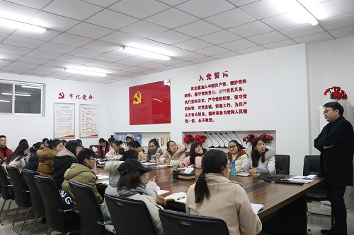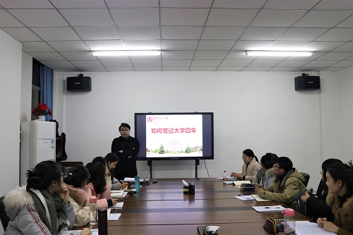 12月12日晚, 2016、2017级本科生联合党支部书记田嘉玺为第1期入党积极分子培训班讲授“如何度过大学四年”专题党课,来自两个学院的40名入党积极分子聚集院办公楼会议室,参与了集中培训。