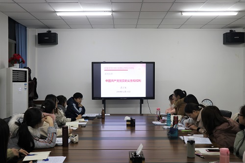 12月11日晚,2015级学生联合党支部书记范子泉作了题为“中国共产党党员的义务和权利”的党课宣讲,学院40名入党积极分子参与聆听。
