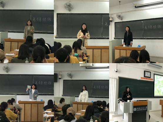 在互动交流环节,五位同学代表针对大家考研学习的困惑、资料准备和复习方法做出了详细的解答。最后陈妍娇老师结合今年考研情况,对当下的考研形势做出分析,她指出学院领导会全程关注考研学生动态,鼓励学生以积极心态备战考研。