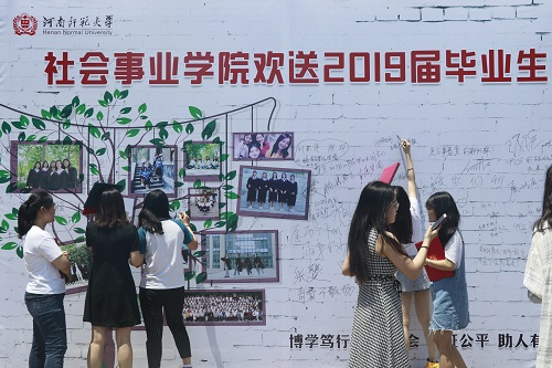 典礼上,毕业生向领导老师与家长献花,送上最真诚的感谢,并一同在印有四年记忆的喷绘墙前合影留念。伴随着《河南师范大学校歌》,毕业典礼落下帷幕。