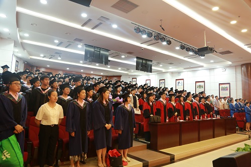 伴随着激昂雄壮的《中华人民共和国国歌》,毕业典礼正式拉开序幕。陈妍娇宣读2019届毕业生学位授予决定,学院领导和教师代表为毕业生授予学位证书并拨苏正冠,林安春宣读优秀毕业生名单,张晨寒为其颁发荣誉证书。