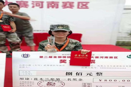 7月12日至13日,第二届全国国防教育竞技大赛河南赛区选拔赛在新乡市南太行军事体验园举行。经过激烈角逐,我院2017级劳动与社会保障班王晗在比赛中荣获佳绩,勇夺女子组第一名,斩获“花木兰”荣誉称号。