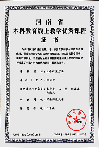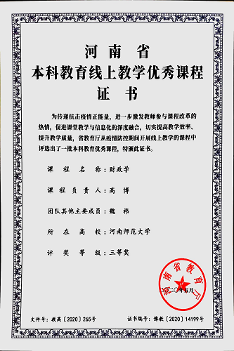 近日,河南省教育厅举办的本科教育线上教学优秀课程获奖名单公布。我院教师高博、陈妍娇及其团队的《财政学》、《社会研究方法》课程分别荣获三等奖。