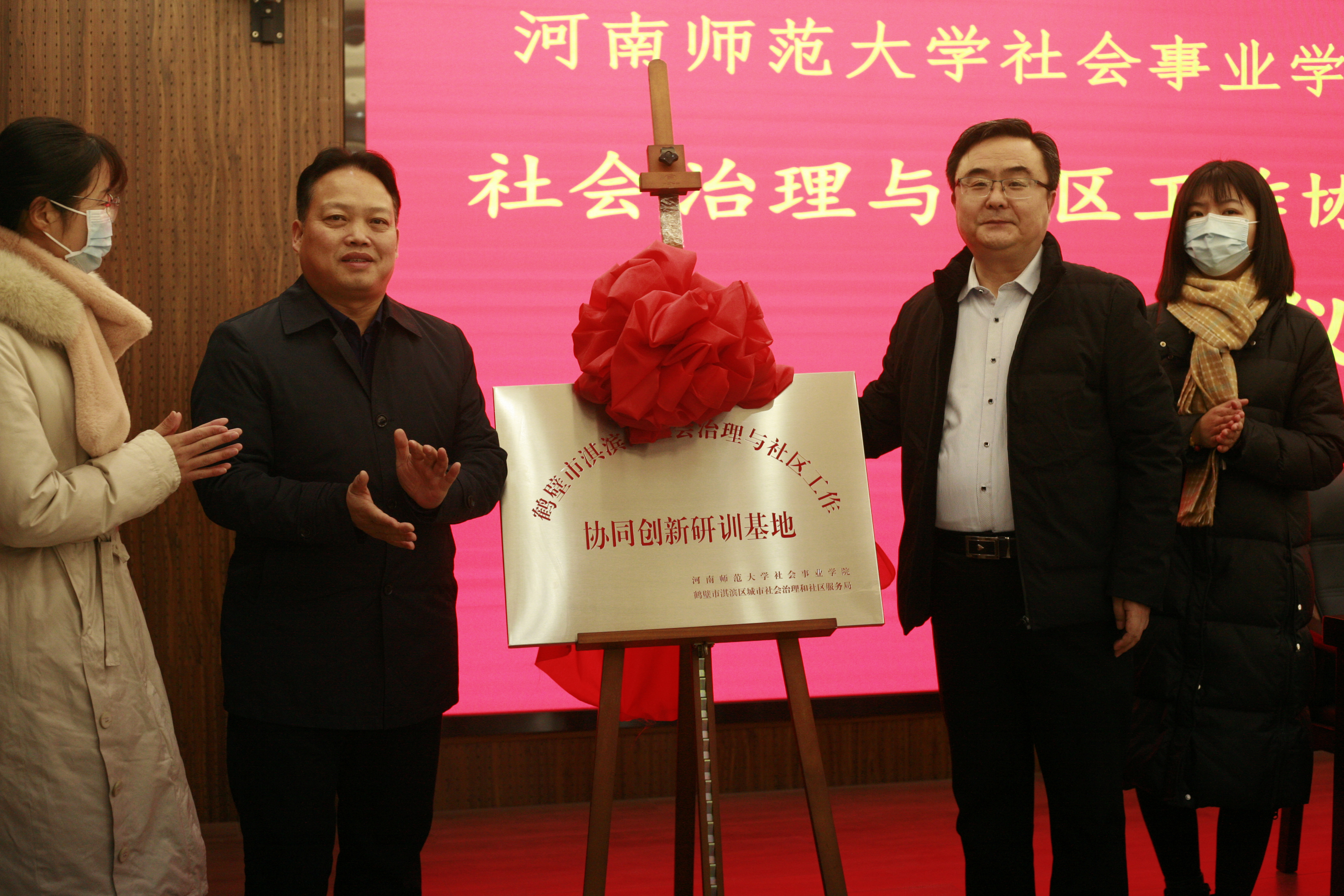 最后,在全场领导、社工、学生的共同见证下,双方进行了隆重的签约和揭牌仪式,标志着河南师范大学社会事业学院——鹤壁市淇滨区“社会治理与社区工作协同创新研训基地”正式成立。