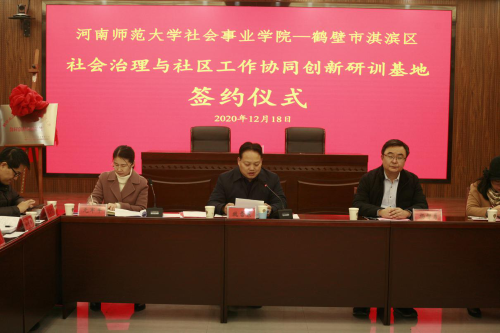 12月18日,我院与鹤壁市淇滨区共建“社会治理与社区工作协同创新研训基地”签约仪式在鹤壁市淇滨区隆重举行。淇滨区委常委、组织部长杨智勇,副区长刘广云,城市社会治理和社区服务局局长元军平;河南省师范大学社会事业学院院长魏雷东,社会工作系主任纪文晓,专业实训中心办公室主任谢启文,2019级社会工作专业全体硕士研究生;鹤壁天山路等五个城区街道主要负责同志、淇滨区社会组织代表等出席会议。大会由淇滨区城市社会治理和社区服务局局长元军平主持。