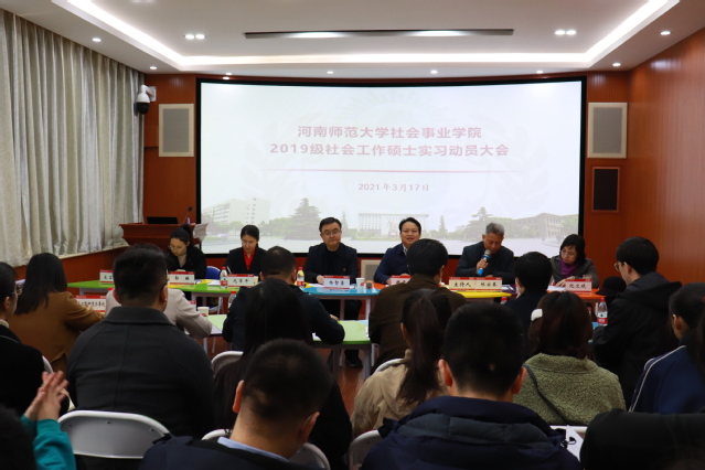 为落实河南师范大学社会事业学院与鹤壁市淇滨区共建研训基地战略协议,积极推动校地共建“社会治理与社区工作协同创新研训基地”,3月17日上午,社会事业学院与鹤壁市淇滨区联合举行河南师范大学2019级社会工作硕士实习动员大会。鹤壁市淇滨区党委常委、组织部长杨智勇,鹤壁市淇滨区城市社会治理和社区服务局局长元军平,社会事业学院负责人及导师代表,淇滨区社区服务中心及街道办事处代表,2019级全体研究生参加会议。会议由社会事业学院党委副书记林安春主持。