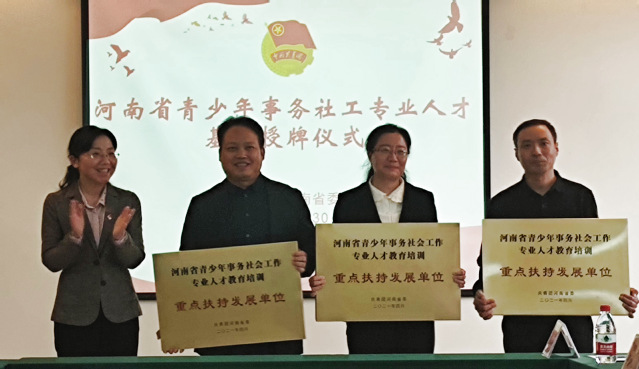 2021年4月30日,共青团河南省委举行河南省青少年事务社会工作专业人才基地授牌仪式,我校获评首批河南省青少年事务社会工作专业人才教育培训重点扶持发展单位。团省委副书记李丽出席活动并讲话,团省委社联部部长李山英主持授牌仪式,我院社会事业学院院长魏雷东、社会工作系主任纪文晓出席活动。