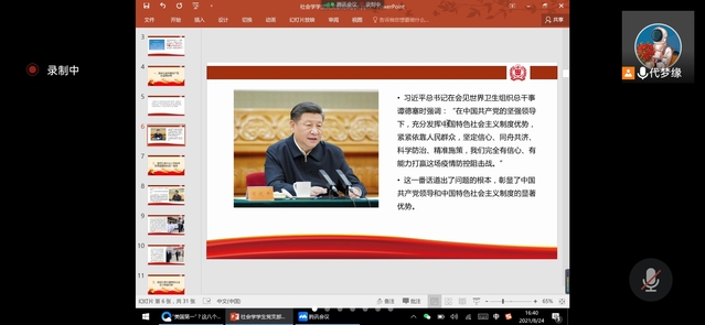 2018级辅导员代梦缘以“抗击疫情中国为什么行——疫情防控更显中国制度优势”为题,通过回顾全国抗疫历程,彰显中国制度优势,从而增强青年学子的“四个意识”,坚定“四个自信”。其中,2019级社会学专业胡靖燕分享道:“作为一名预备党员,应该积极参与到疫情防控,在实践中体会为人民服务的真正内涵。”