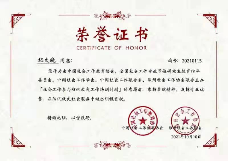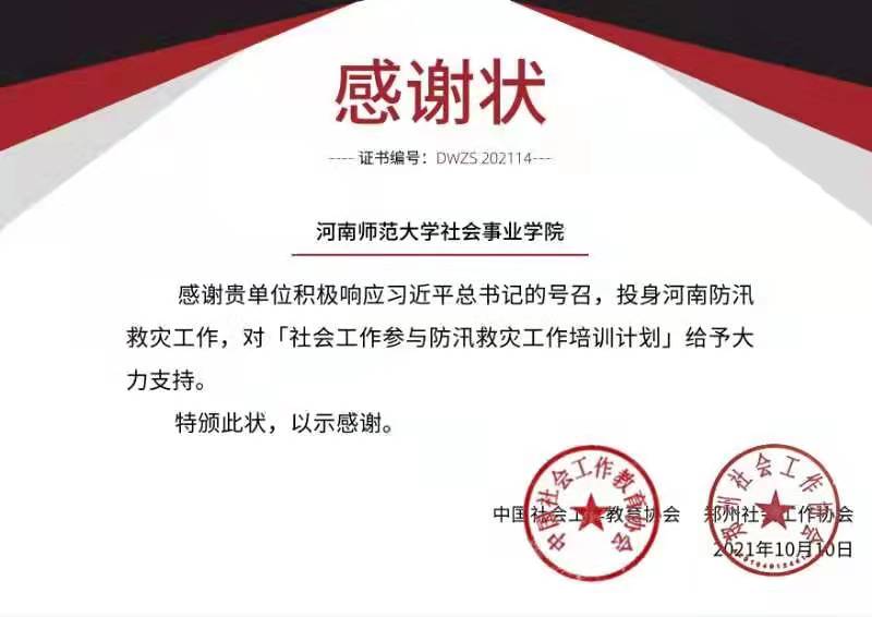 近日,中国社会工作教育协会向我院发来感谢信和荣誉证书,对学院全力支持“社会工作参与防汛救灾工作培训课程”计划表示感谢,对学院教师纪文晓在防汛救灾志愿服务中做出的积极贡献予以表扬。