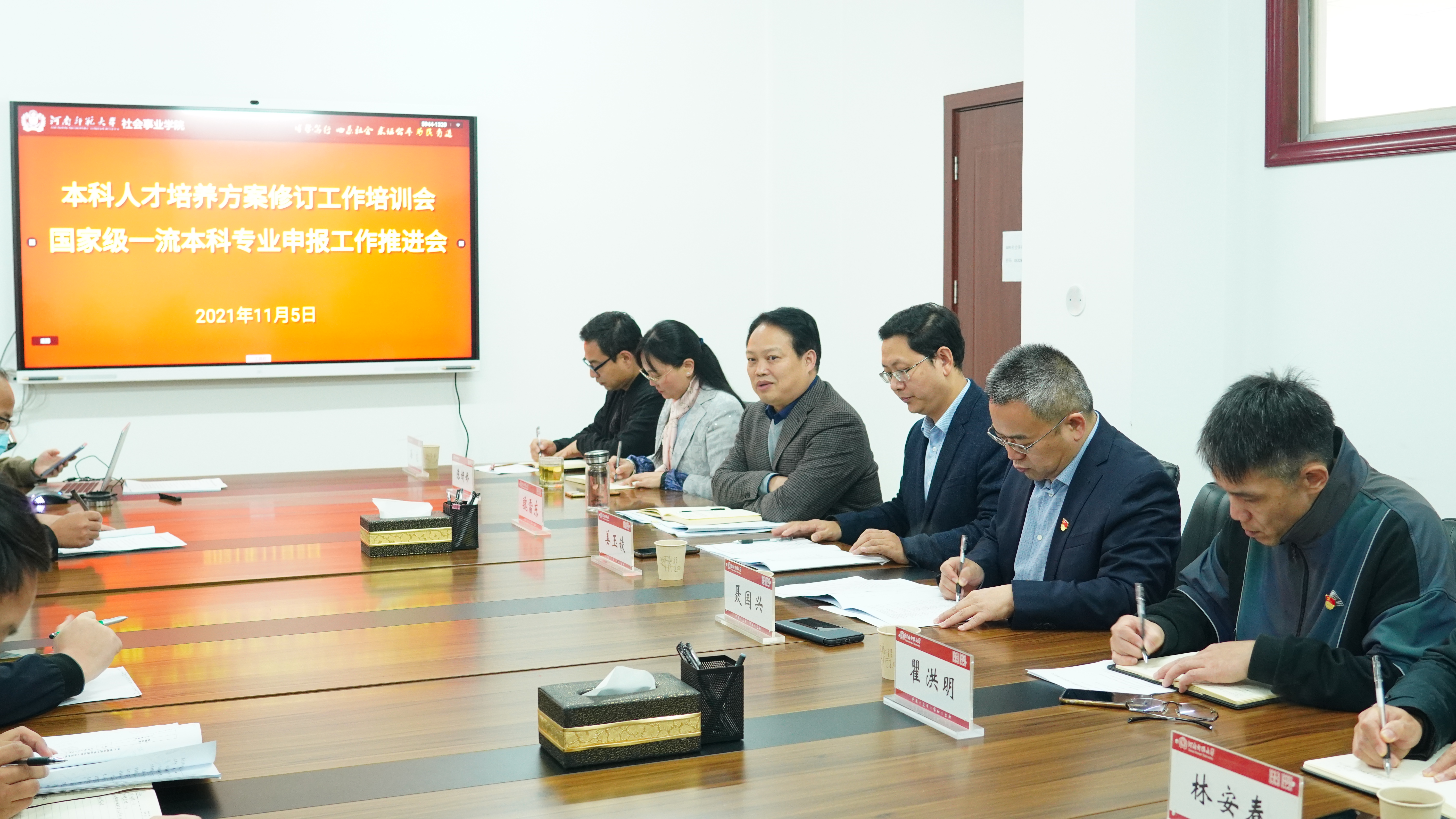 为扎实有序推进本科人才培养方案修订工作及国家一流本科专业申报工作,11月5日,学院本科人才培养方案修订工作培训会暨国家级一流本科专业申报工作推进会在崇智楼210召开。教务处处长聂国兴、副处长姜玉钦,社会事业学院班子、各系负责人及骨干教师参加会议。会议由院长魏雷东主持。