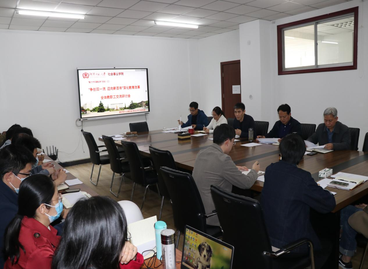 4月19日下午,社会事业学院在210会议室召开“争创双一流,迈向新百年”深化教育改革全体教职工研讨会。学院全体教职工参加。会议由院党委书记瞿洪明主持。