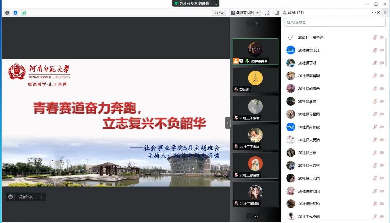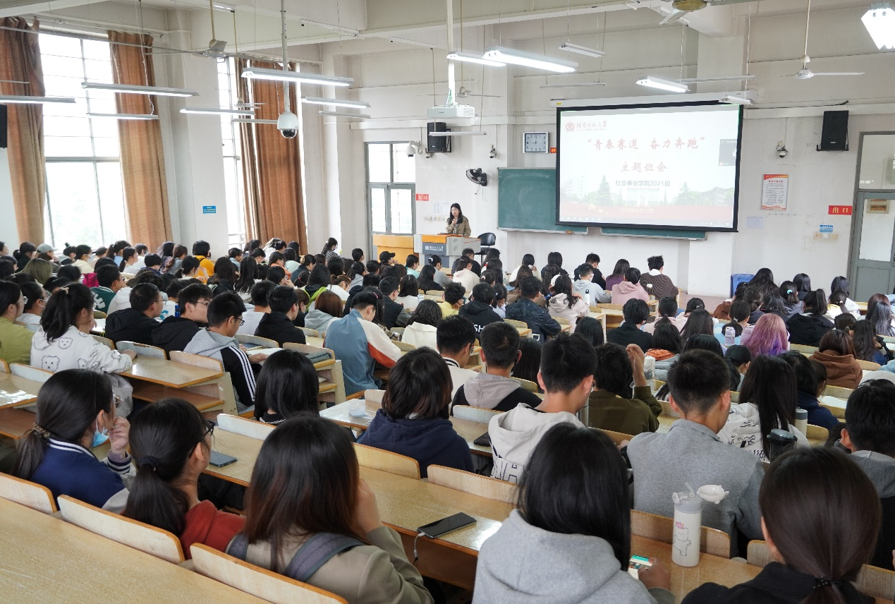 为深入学习领会习近平总书记在中国人民大学考察时的重要讲话精神,激励青年在青春的赛道上奋力奔跑,近日,社会事业学院各年级通过线上线下相结合的方式分别召开“青春赛道,奋力奔跑”主题班会。各年级学生与辅导员共同参与其中。