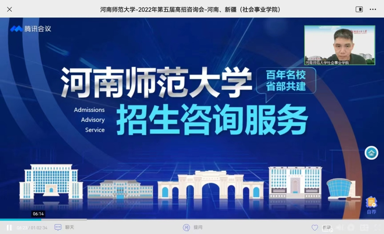 为方便广大考生和家长深入了解学校和学院办学特色、优势专业学科、招生政策等情况,6月26日,社会事业学院就河南省和新疆维吾尔族自治区两地召开“2022年第五届高招线上咨询会”。学院党委书记瞿洪明主持此次会议。本次咨询会观看直播人数累计3000余名。