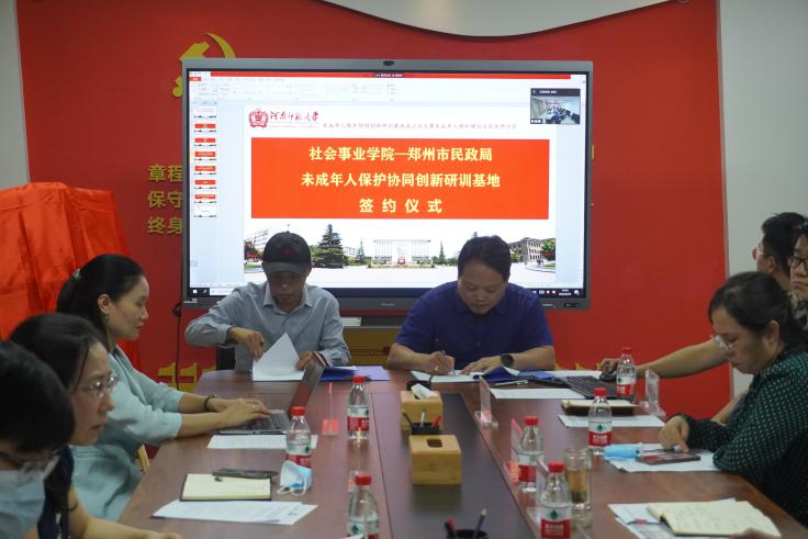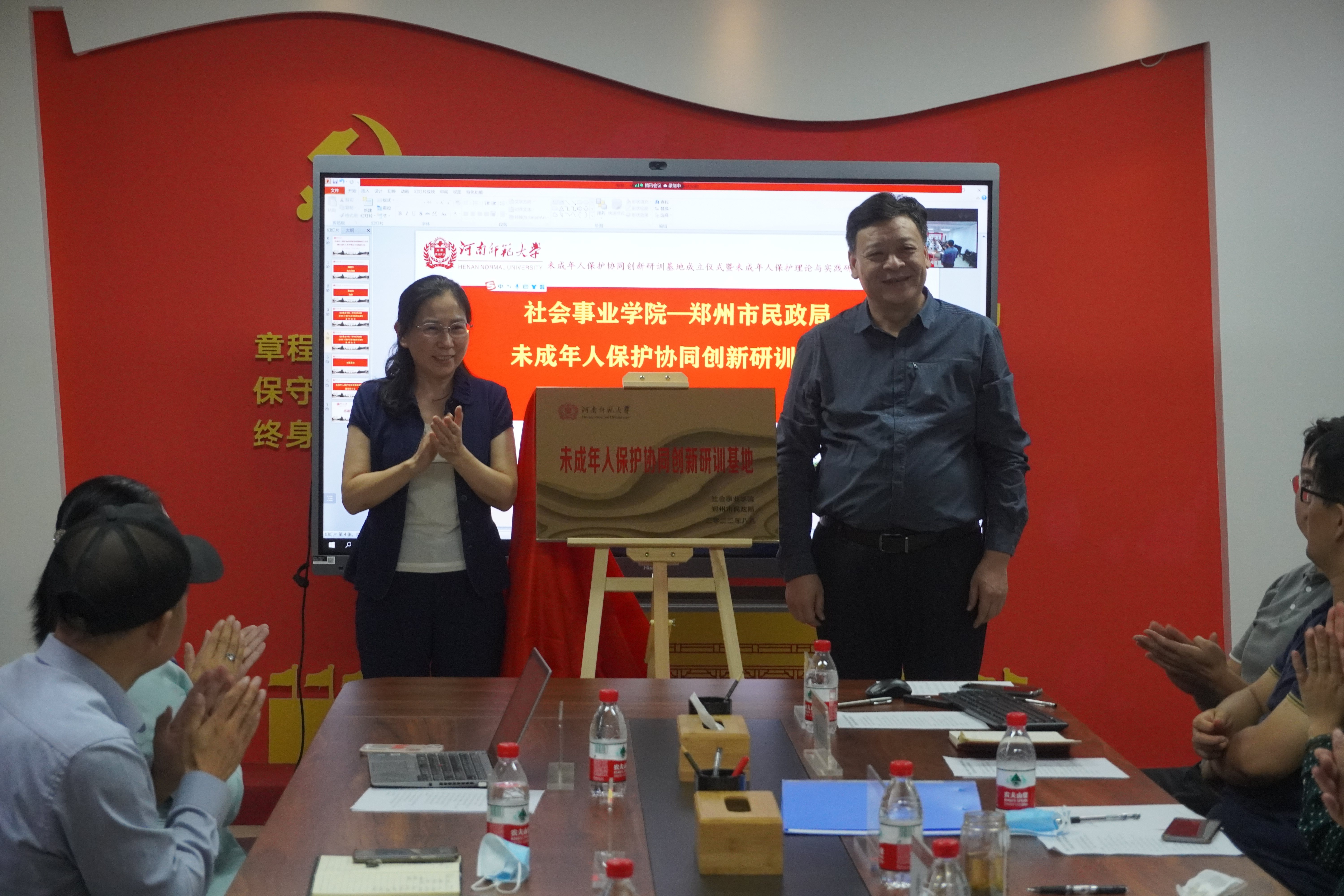 紧接着,在线上和线下与会嘉宾的共同见证下,双方进行了隆重的签约和揭牌仪式,标志着河南师范大学社会事业学院——郑州市民政局“未成年人保护协同创新研训基地”的正式成立。