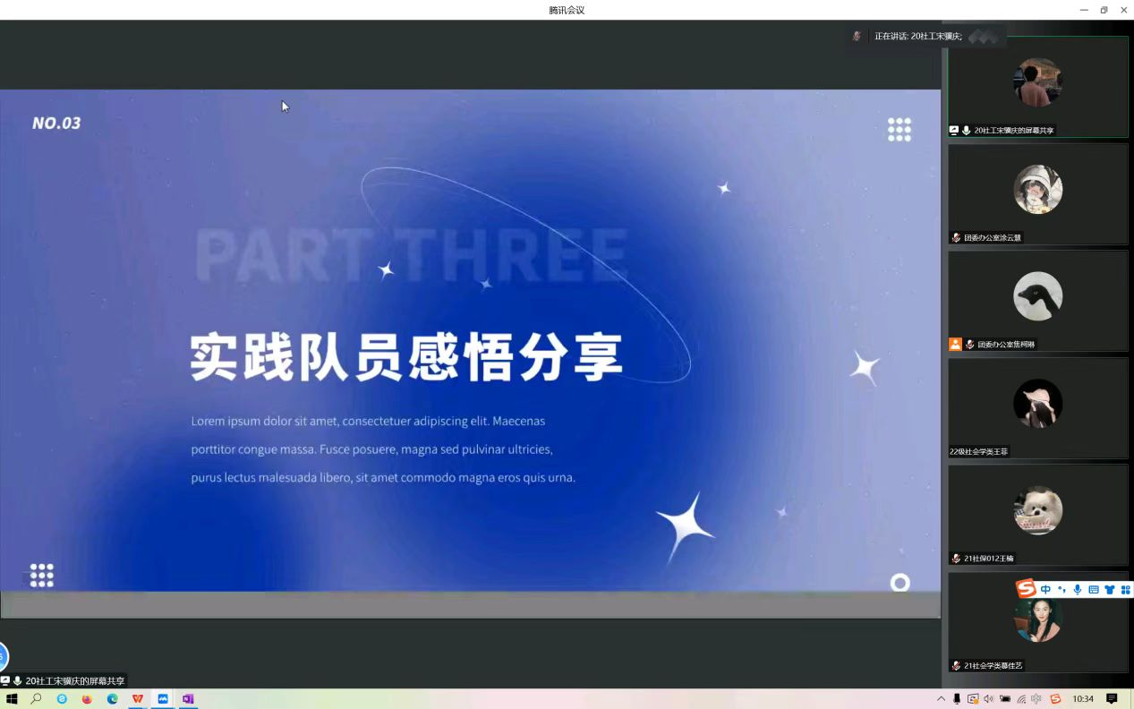 会议伊始,崔晓晓向与会学生介绍了此次暑期实践活动的开展情况。随后,“豫见最美夕阳,乐享幸福人生”乡村老年人生命历程口述史调研团和“助力为老服务,情暖守望银龄”乡镇社工站为老服务调研团的代表队员就自身在暑期实践活动中的所见所闻,分享自身所思所感。其中,2021级劳动与社会保障班王楠向大家展示她针对两位采访对象设计的采访提纲,分享在采访老人中令她印象深刻的环节,并向与会学生讲述她的收获与感悟。最后,崔晓晓对此次活动进行总结,并鼓励与会学生踊跃参加暑期“三下乡”社会实践活动,丰富自己的人生和社会阅历。