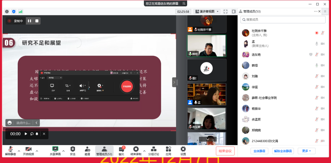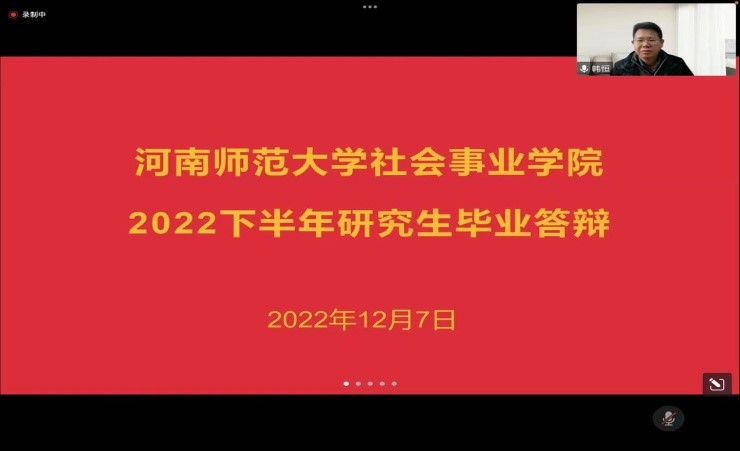 12月7日,河南师范大学社会事业学院举行2022下半年硕士研究生毕业答辩会,9名毕业生参与此次答辩,答辩会采取线上方式进行。郑州大学郑州与公共管理学院副院长韩恒教授担任答辩主席,会议由孟利艳副院长主持。