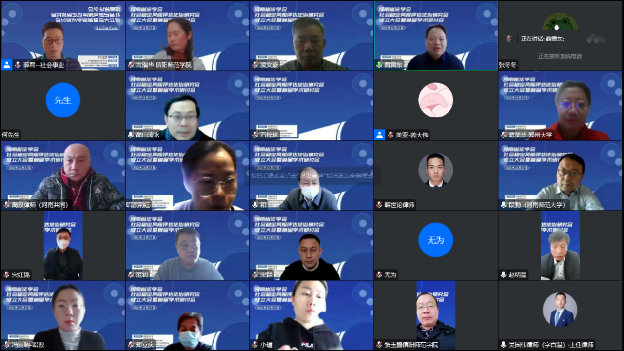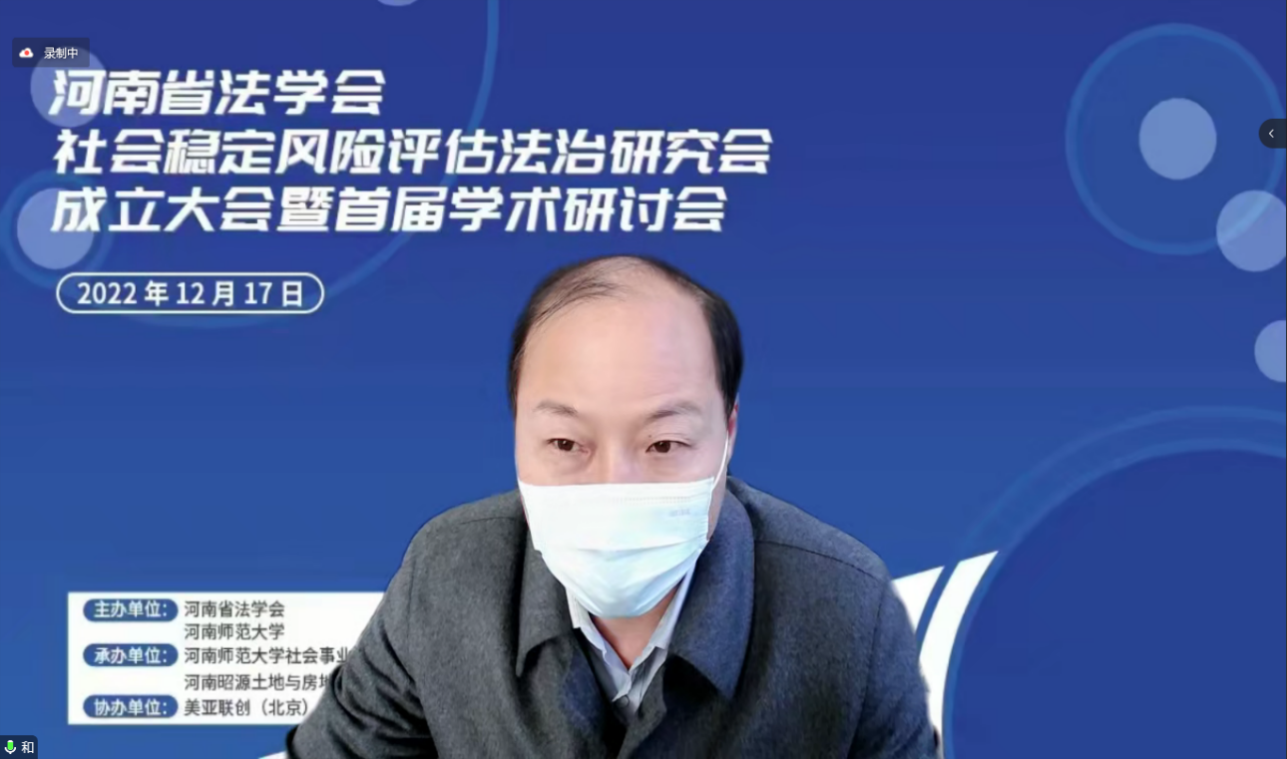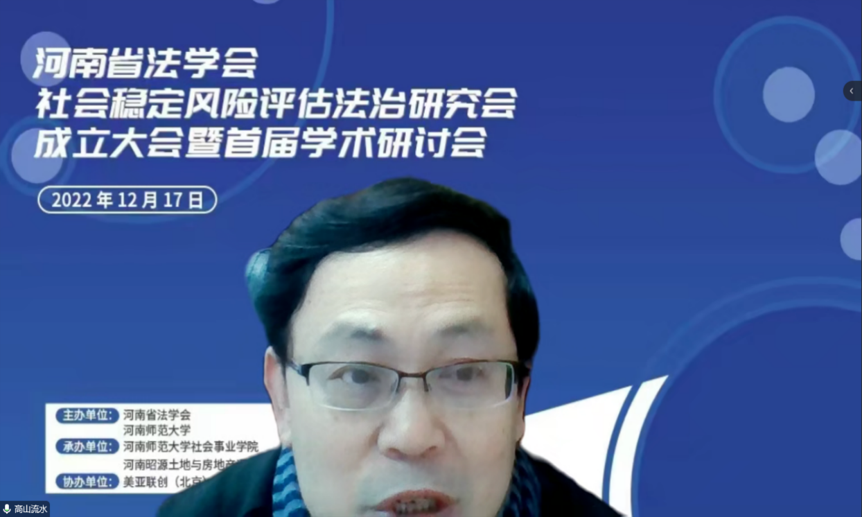 12月17日,河南省法学会社会稳定风险评估法治研究会成立大会暨首届学术研讨会在河南新乡召开。中国应急管理学会社会风险评估与治理工作委员会副会长童星教授、施国庆教授出席会议致贺并作学术报告,河南省法学会赵明星处长,河南师范大学党委副书记、工会主席梅宪宾,河南师范大学副校长李雪山等出席会议并讲话。大会由河南师范大学社会事业学院院长魏雷东主持。