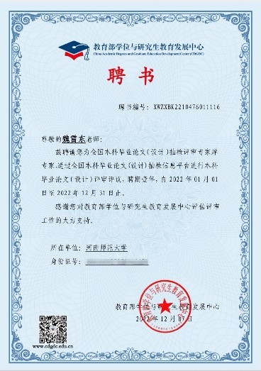 为了加强和改进教育督导评估监测,保证本科人才培养基本质量,2022年8月,教育部首次面向全国高校开展2022年度本科毕业论文(设计)抽检和专家库建设工作。根据《关于做好全国本科毕业论文(设计)抽检信息平台和专家库建设工作的通知》(学位中心函〔2022〕4号)等文件要求,通过学院组织的推荐和报送工作,魏雷东教授被聘请为全国本科毕业论文(设计)抽检评审专家库专家。