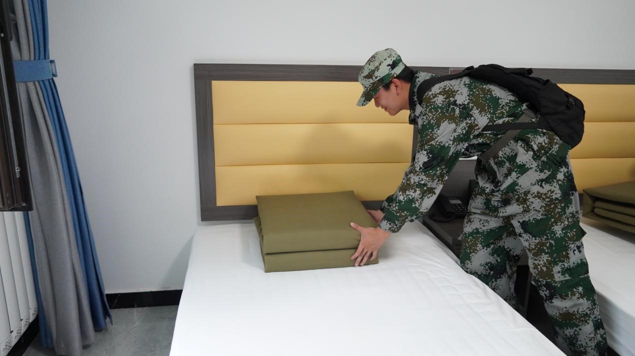 学生刚踏进教官宿舍就不由的发出惊叹声和疑惑声,每一间宿舍都整洁清新,“豆腐块”被子被整齐地摆放在床头,床单平坦干净,洗漱用品有序摆放,鞋子脸盆整齐划一,方向全部一致。柜子里整齐的摆放着教官的衣服,衣服从长到短两边悬挂。有好奇的同学向教官请教叠“豆腐块”的技巧,教官耐心向他们讲解折叠方法及具体要求,“三分叠七分修”,从床铺、衣柜的整理到被子的棱角都做了细致讲述。
