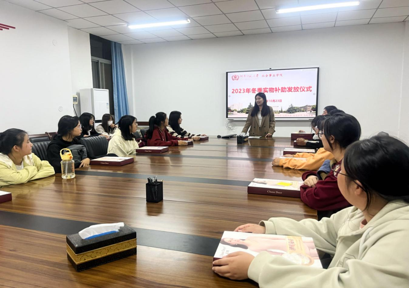 为保证2023级家庭经济困难学生顺利过冬,提升资助育人实效,10月23日晚,学院于崇智楼210会议室举行2023级新生冬季实物补助发放仪式,2023级专职辅导员韩雅冰、兼职辅导员郭金龙、2023级受助学生参加仪式。
