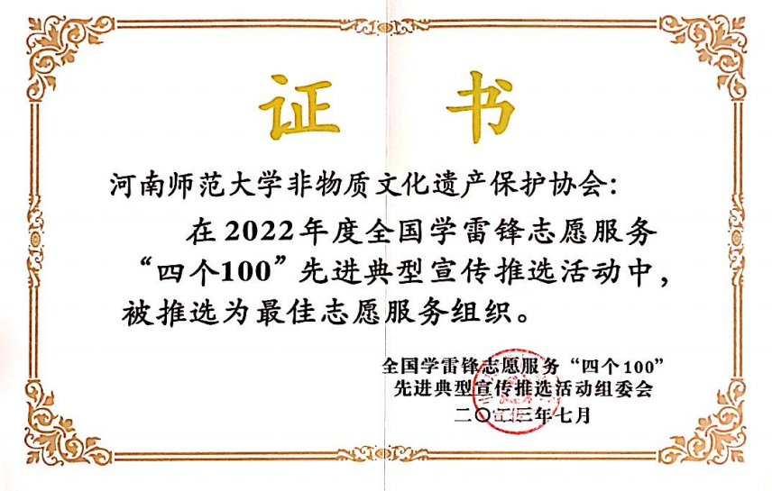近日,全国学雷锋志愿服务“四个100”先进典型名单出炉,我校文学院丁永祥教授领衔、中国志愿服务研究中心河南(新乡)分中心孵化培育的河南师范大学非物质文化遗产保护协会,荣获“最佳志愿服务组织”荣誉称号。