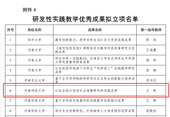 近日,河南省教育厅下发了《关于河南省本科高校研究性教学系列项目拟立项名单的公示》,学院教师王萌申报的《以社会统计促进社会保障研究的实践成果》获批研发性实践教学优秀成果立项,为我校在该项的唯一获批成果。