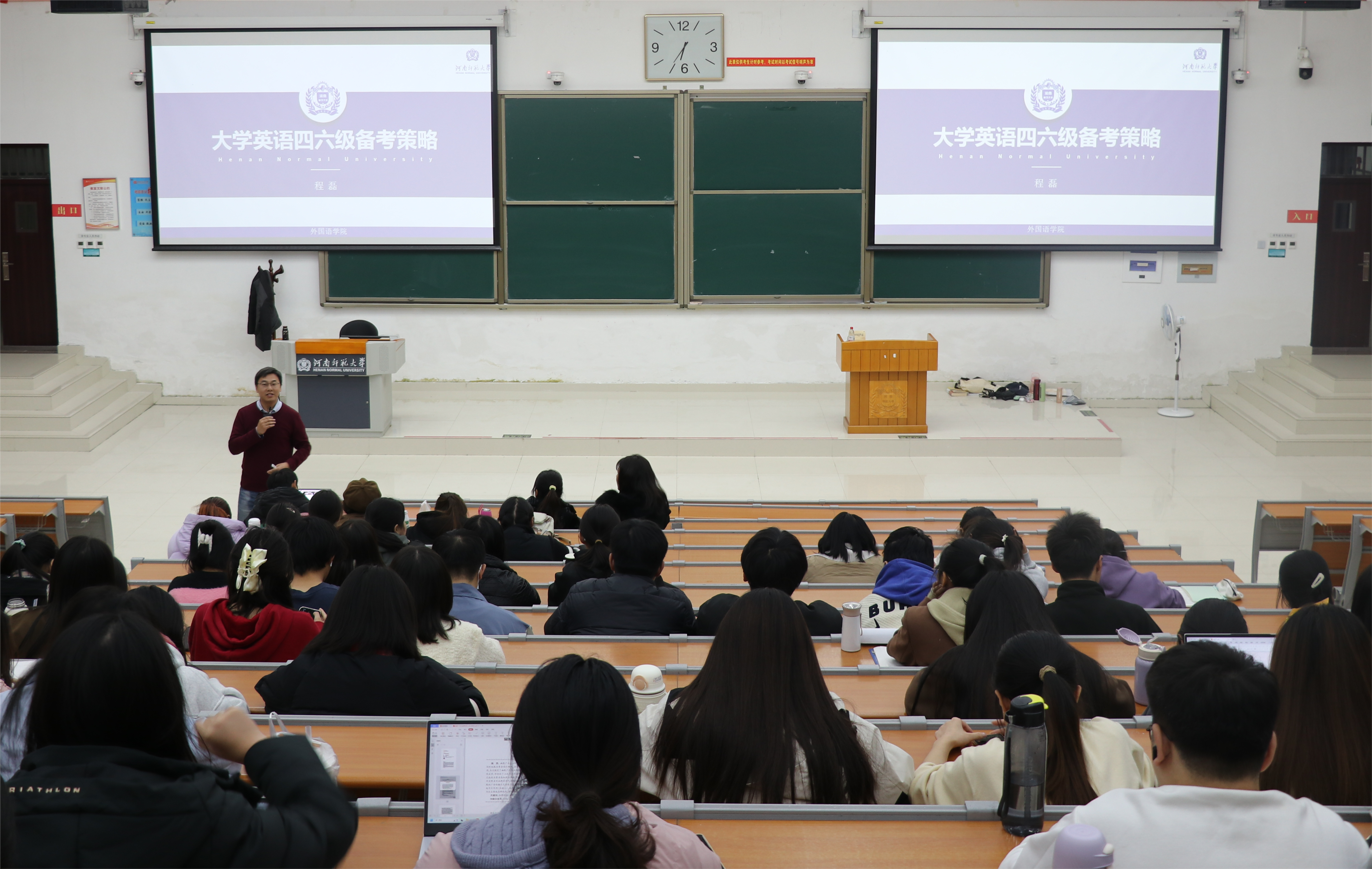 为帮助学生全面高效把握英语四六级考试题型、解题思路和技巧、全方位提高学生英语能力,12月7日晚,学院在文昌楼102教室举办四六级备考专题培训讲座。外国语学院教师程磊应邀做专题培训,学院近300名学生参加。此前,12月3日上午,学院在启智楼5楼为学院学生组织了英语四六级模拟考试。
