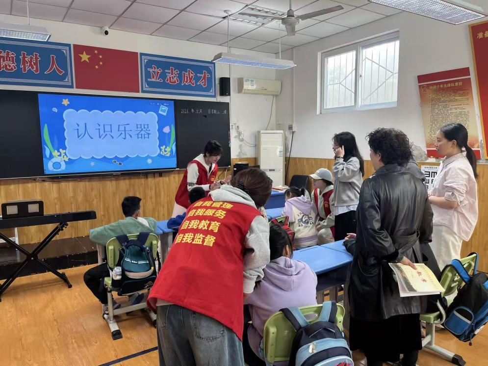 10时10分,第二节课走进一年级三班。志愿者们放慢语速、蹲下身子,用微笑和重复示范回应孩子们的每一次反应。部分儿童起初较为拘谨,但在鼓声与琴声的吸引下逐渐放松,主动伸手触摸琴键。社会学院志愿者同步记录行为表现,为后续融合教育支持积累第一手资料。