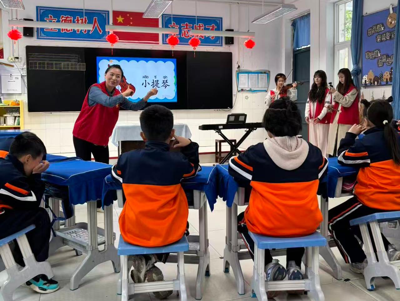 本次活动由社会学院与音乐舞蹈学院师生共同策划,并邀请新乡市直第一幼儿园一级教师聂伟伟担任主讲。课程内容兼顾认知与体验:先引导孩子们观察和触摸四种乐器,了解其外形与音色差异;再通过拍手、敲击等方式学习四分音符与八分音符的节奏变化。音乐舞蹈学院学生担任助讲,社会学院学生担任机动人员,全程观察记录并协助情绪疏导。