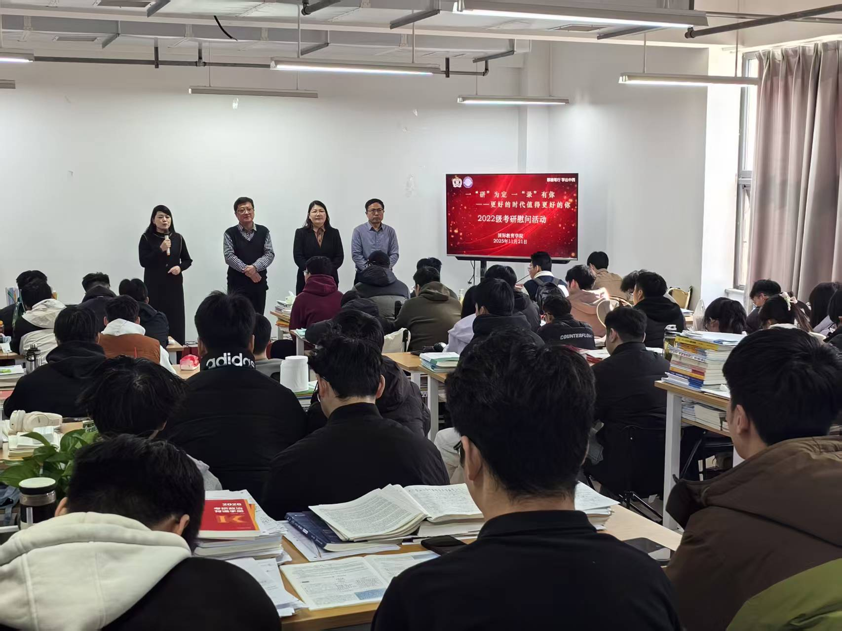 朔风虽劲,暖意常存赤子心;征途漫漫,更显校园温情浓。为缓解考研学子的压力,鼓舞士气、坚定信心,11月21日,国际教育学院在实训楼723A自习室举办了以“一‘研’为定,一‘录’有你 ——更好的时代值得更好的你”为主题的考研慰问活动。国际教育学院、佩皮尼昂国际理工学院相关负责人、辅导员以及2022级百余名考研学生共同参与了此次活动。