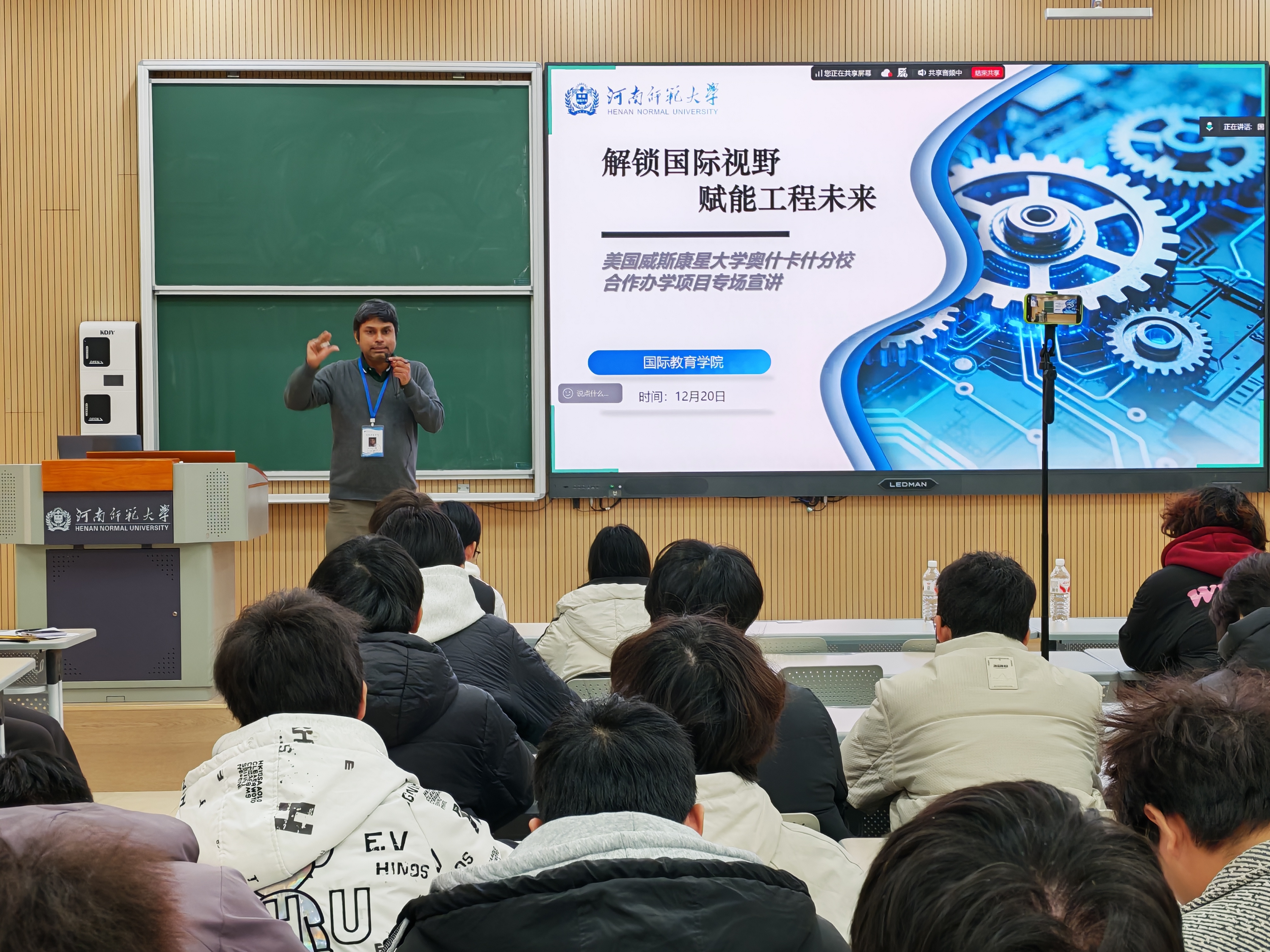 12月20日上午,国际教育学院邀请美国威斯康星大学奥什科什分校的电气工程技术专业负责人Ahmed Nasif副教授举行“解锁国际视野,赋能工程未来”为主题的合作办学项目宣讲会,活动在科技创新港3号书院多功能报告厅以及东校区求真楼714教室线上线下同步进行。学院电气工程及其自动化专业2024与2025级学生参加活动,国际教育学院院长赵扬与副院长田月红分别主持活动。