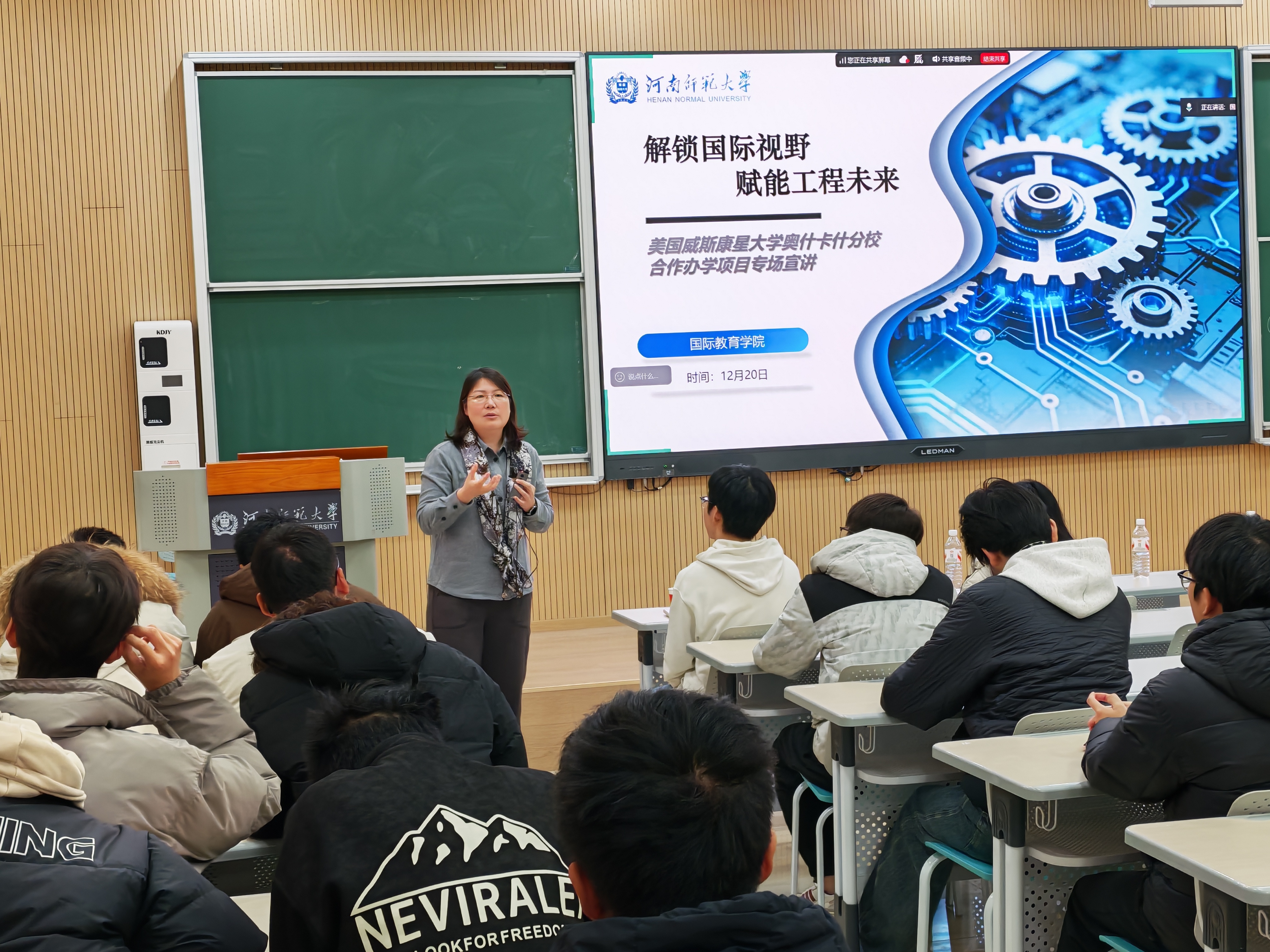 Ahmed Nasif在宣讲中全面介绍了威斯康星大学奥什科什分校的办学特色、校园文化以及电气工程专业的课程体系、师资力量与发展前景。他通过播放实验室实景视频和分享学生的科研作品及创新心得,让同学们直观感受到海外优质工程教育的教学条件与实践平台。同学们围绕专业学习与未来发展踊跃提问。赵扬在与同学们的交流中系统阐释了“在地国际化”的培养理念。她指出,提升“在地国际化”质量,既注重学生专业基础的夯实,更着力培养其国际视野、跨文化沟通能力和全球竞争力。她特别寄语同学们要重视英语能力提升,并尽早做好学业规划,为未来多元化发展奠定坚实基础。