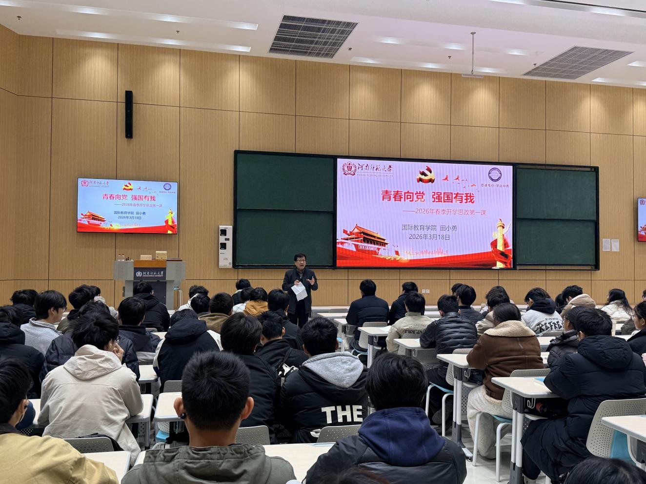 为深入学习贯彻党的二十届四中全会精神和2026年全国两会精神,激发国教学子奋进新征程的昂扬斗志,3月18日下午,国际教育学院于科技创新港校区生科楼报告厅举办“青春向党 强国有我”2026年春季开学思政第一课活动。学院党委书记田小勇出席活动并授课,辅导员李明、方新建及2025级电气工程及其自动化专业全体学生参加活动。