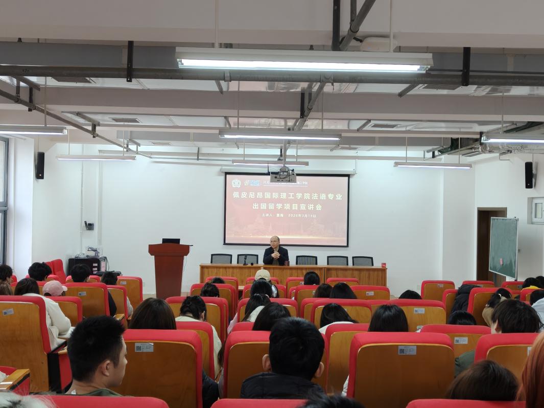 3月19日,佩皮尼昂国际理工学院在实训楼701报告厅举办出国留学项目宣讲会,院长董海主讲,面向法语专业学生系统介绍专业发展趋势与多元化培养路径。