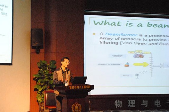 陈华伟教授的报告主要介绍了麦克风阵列处理技术。陈教授首先介绍了麦克风阵列处理技术在免提语言通信、助听器、多媒体等领域的广泛应用,并介绍了该技术的一些技术背景,包括麦克风阵列的功能、研究现状等和一些典型的应用实例。最后介绍了其课题组近年来在麦克风阵列波束形成方面的一些代表性的研究成果。