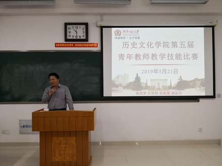 2019年5月21日晚,历史文化学院第五届青年教师教学技能比赛在东综215教室举行。比赛由鞠明库副院长主持,赵振老师、王守谦教师、蔡蕾老师、苏东坡老师等担任评委,历史文化学院7名青年教师参加了比赛,2015级、2018级部分本科生参与了本次活动。
