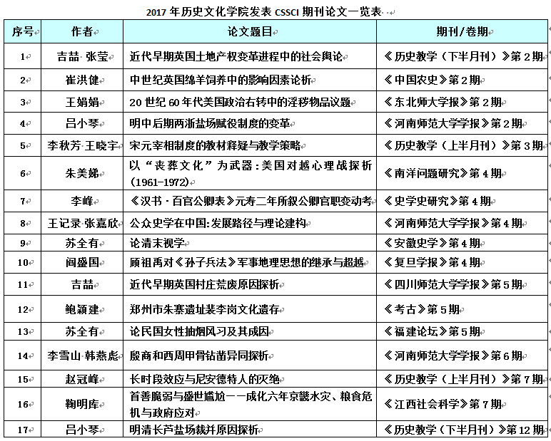 2017年历史文化学院发表CSSCI期刊论文一览表