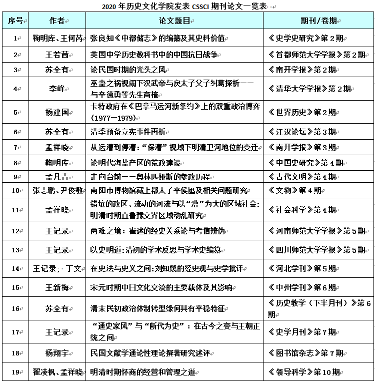 2020年历史文化学院发表CSSCI期刊论文一览表