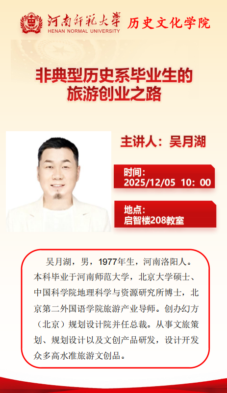 吴月湖,男,1977年生,河南洛阳人。河南师范大学历史学专业本科毕业,北京大学城市与环境学院硕士、中国科学院地理科学与资源研究所博士,北京第二外国语学院旅游产业导师。先后担任国内多家大型旅游规划机构技术副总裁,创办幻方(北京)规划设计院并任总裁。从事旅游规划学习、研究与实践工作二十余年,先后参与、主持国内外文旅策划、规划、设计数百项,并设计开发了众多高水准旅游文创品。