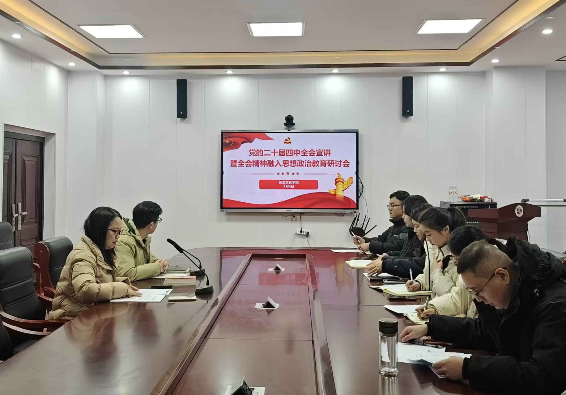 1月4日,历史文化学院在学院305会议室举办党的二十届四中全会宣讲暨全会精神融入思想政治教育研讨会。院党委书记肖亮亮担任主讲,院党委副书记郭委主持会议,全体专兼职辅导员参加会议。