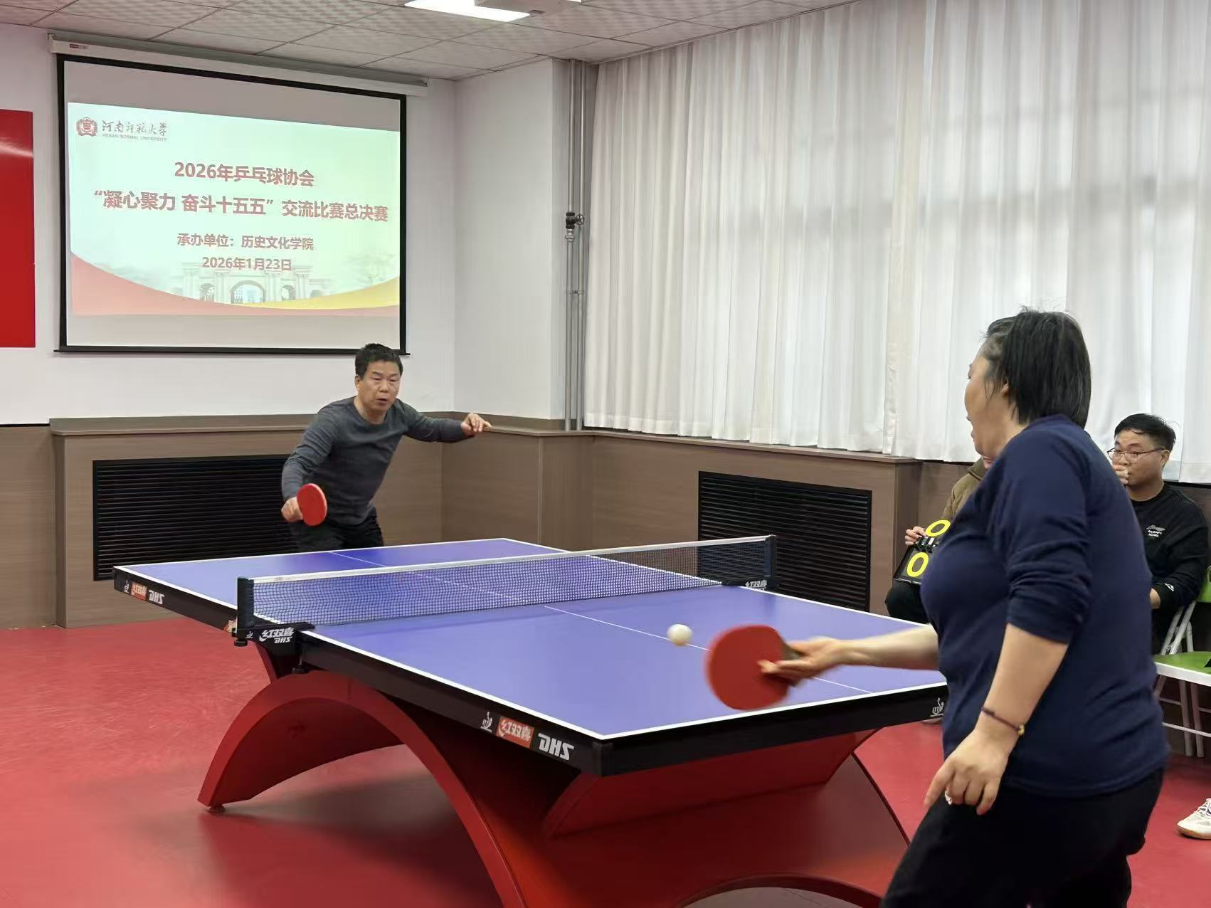 2026年校乒乓球协会“凝心聚力·奋斗十五五”交流比赛于1月19日至23日在历史文化学院教职工活动室顺利举办。我院作为本次赛事的分赛场承办方及决赛举办场地,学院领导高度重视,全程统筹部署、细化流程,从场地规划到服务保障均逐项落实,全力为这场体育交流盛会提供有力支持,充分体现了学院对赛事组织的高度重视与全面保障。