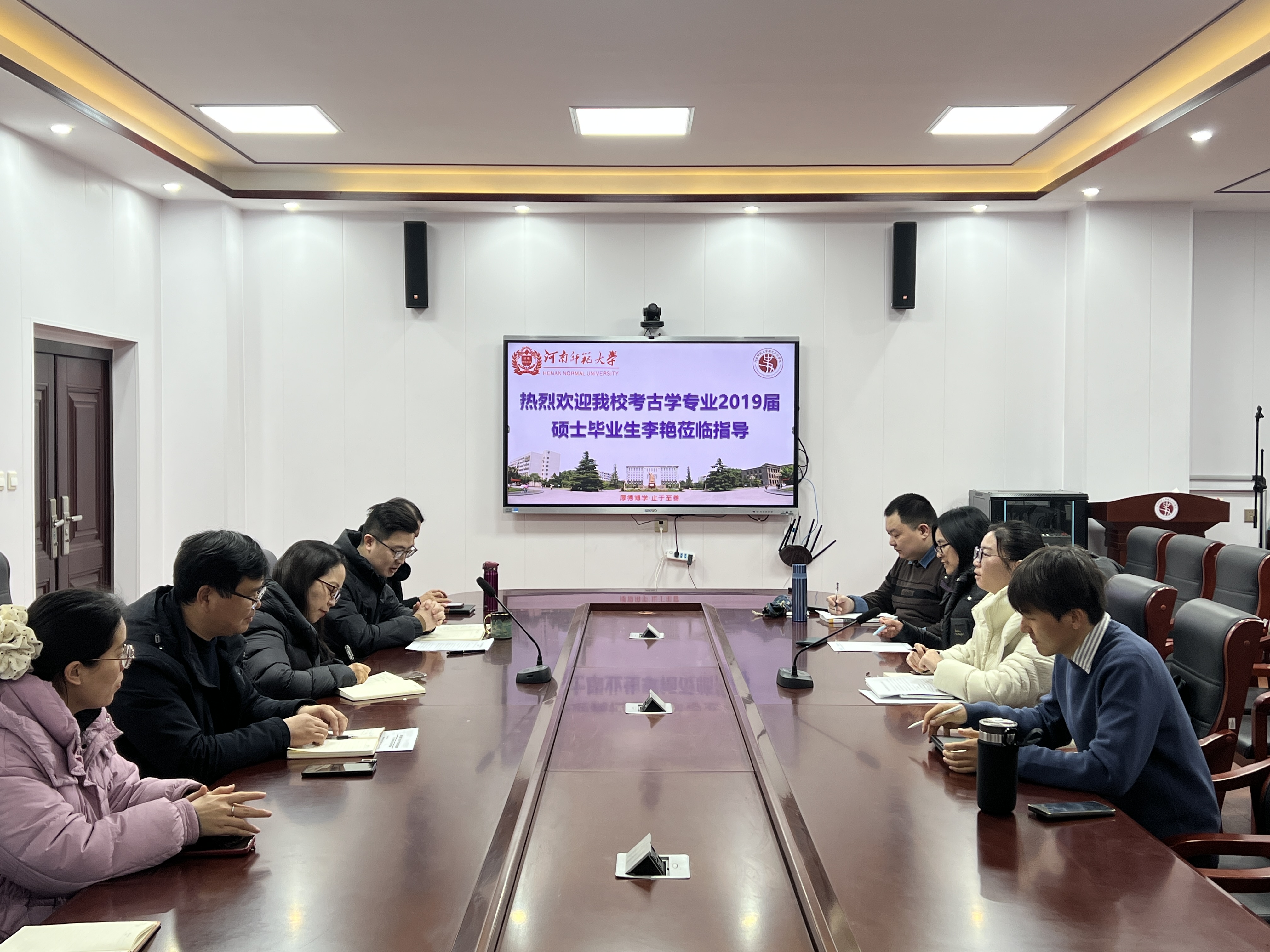 1月26日上午,我校考古学专业2019届硕士毕业生李艳应学院邀请,在崇德楼305会议室开展座谈,院党委书记肖亮亮、副书记郭委、副院长鲍颖建、副院长薛敏及考古学专业教师代表参会,座谈会由郭委主持。