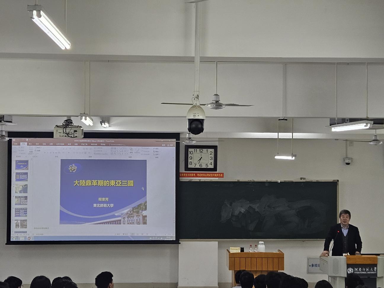 2026年3月30日晚上,东北师范大学韩东育教授应邀莅临河南师范大学历史文化学院,于东校区文昌楼203教室作题为“大陆革鼎期的东亚三国”的学术讲座。本次讲座由我院李峰院长主持,世界史系师生到场聆听。