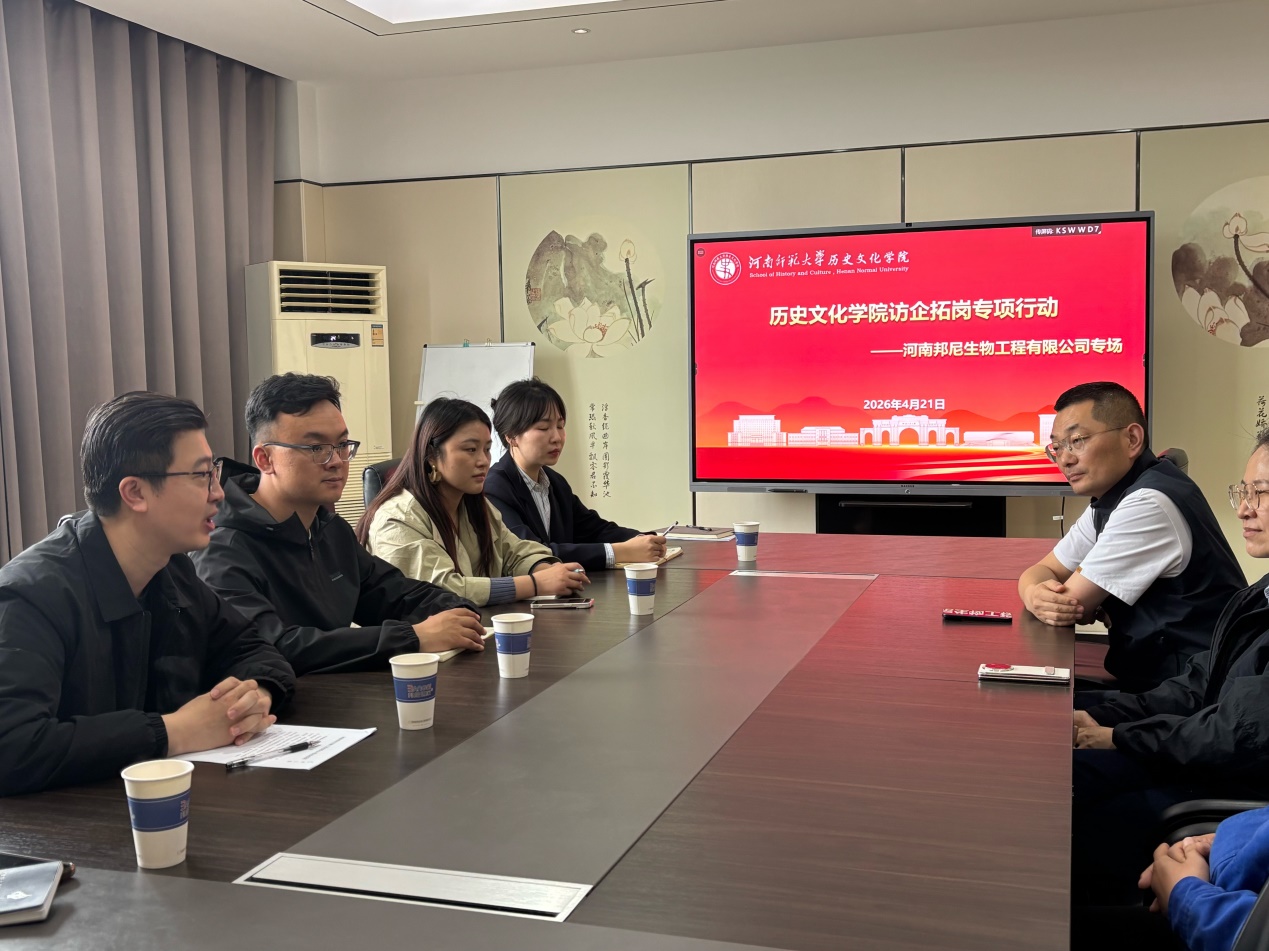 为持续拓宽毕业生就业渠道,全力促进毕业生高质量充分就业,2026年4月21日下午,历史文化学院党委副书记郭委、团委副书记庞振康带领辅导员肖党霞、常筱沛及2026届毕业生代表孟君豪,前往河南邦尼生物工程有限公司开展“访企拓岗”专项活动。