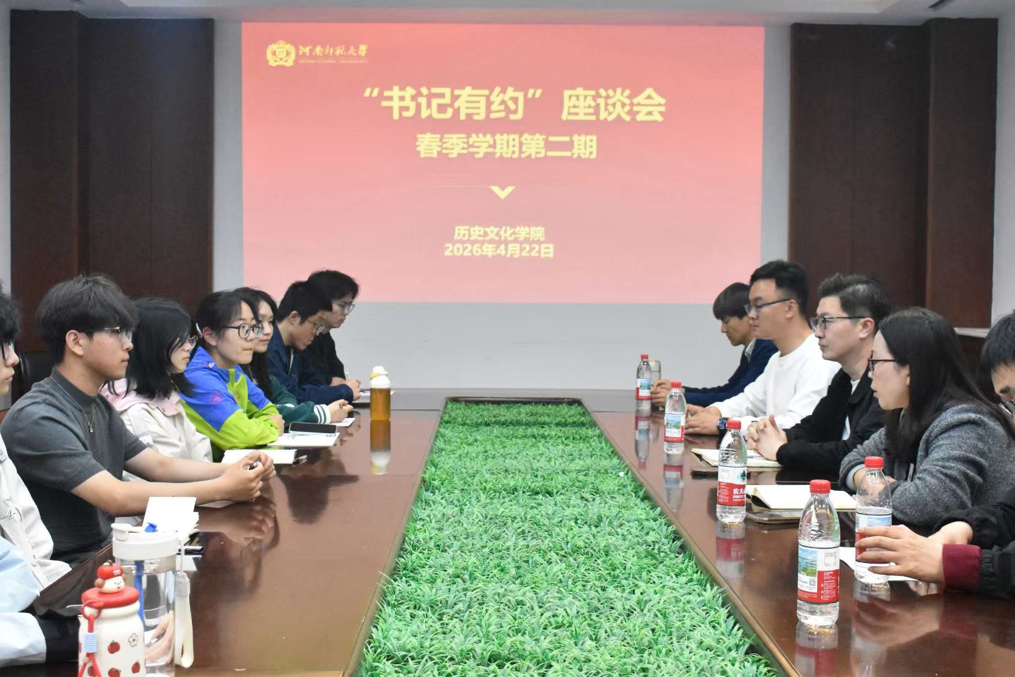 为扎实开展树立和践行正确政绩观学习教育,精准把握学生成长需求,畅通师生沟通渠道,4月22日下午,历史文化学院在崇德楼205会议室举办2025-2026学年春季学期第二期“书记有约”座谈会。学院党委书记肖亮亮、党委副书记郭委,各专业系主任出席会议,2025级本科生及研究生代表参加座谈。会议由学院团委副书记庞振康主持。
